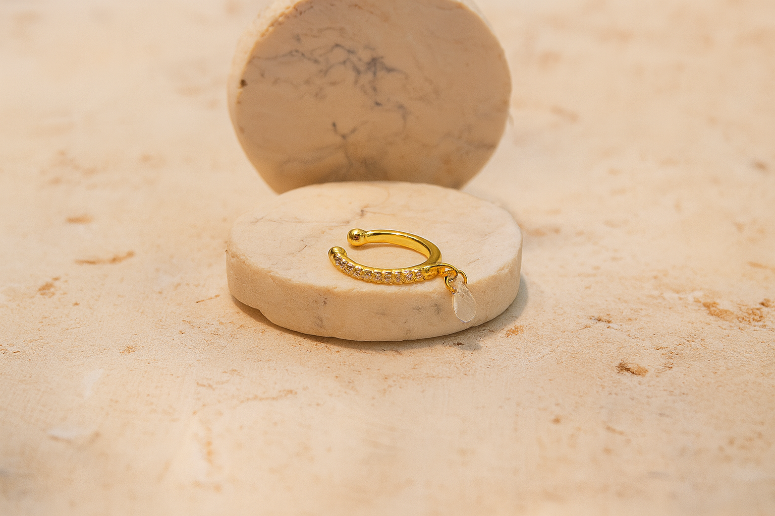 Earcuff dorado con circonias blancas engastadas y un delicado dije de circonia en forma de gota que aporta un brillo sutil y elegante.n