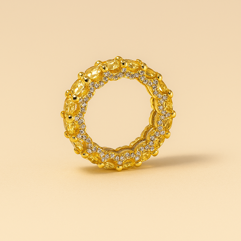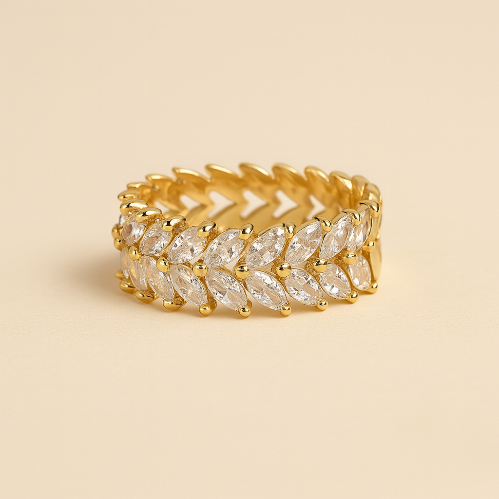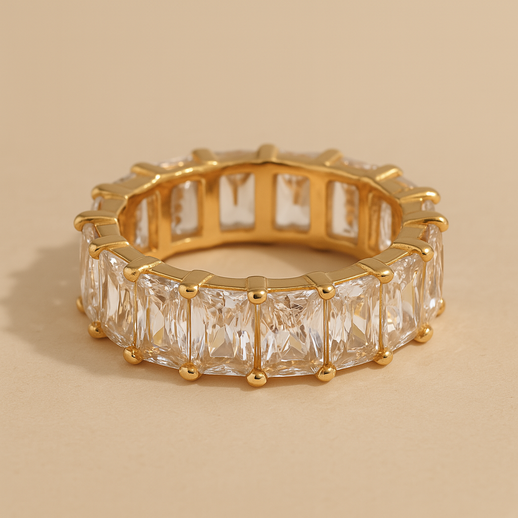 Anillo dorado con doble hilera de circonias blancas y un dije en forma de candado, decorado con piedras y una gema verde en corte esmeralda al centro. Moderno, simbólico y elegante.