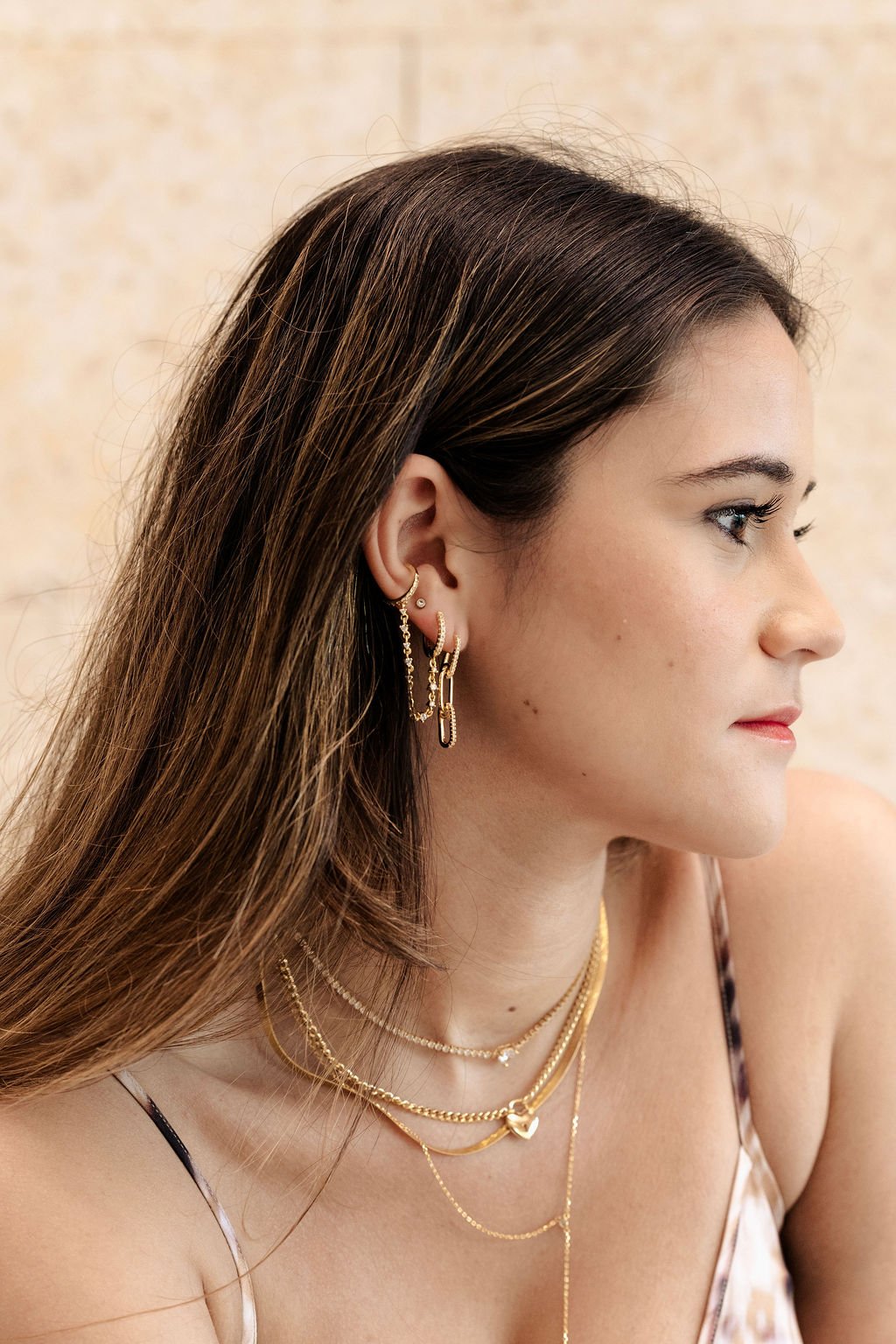 Aretes dorados con aros de circonias blancas, un delicado dije de corazón y una fina cadena que termina en un brillo sutil.