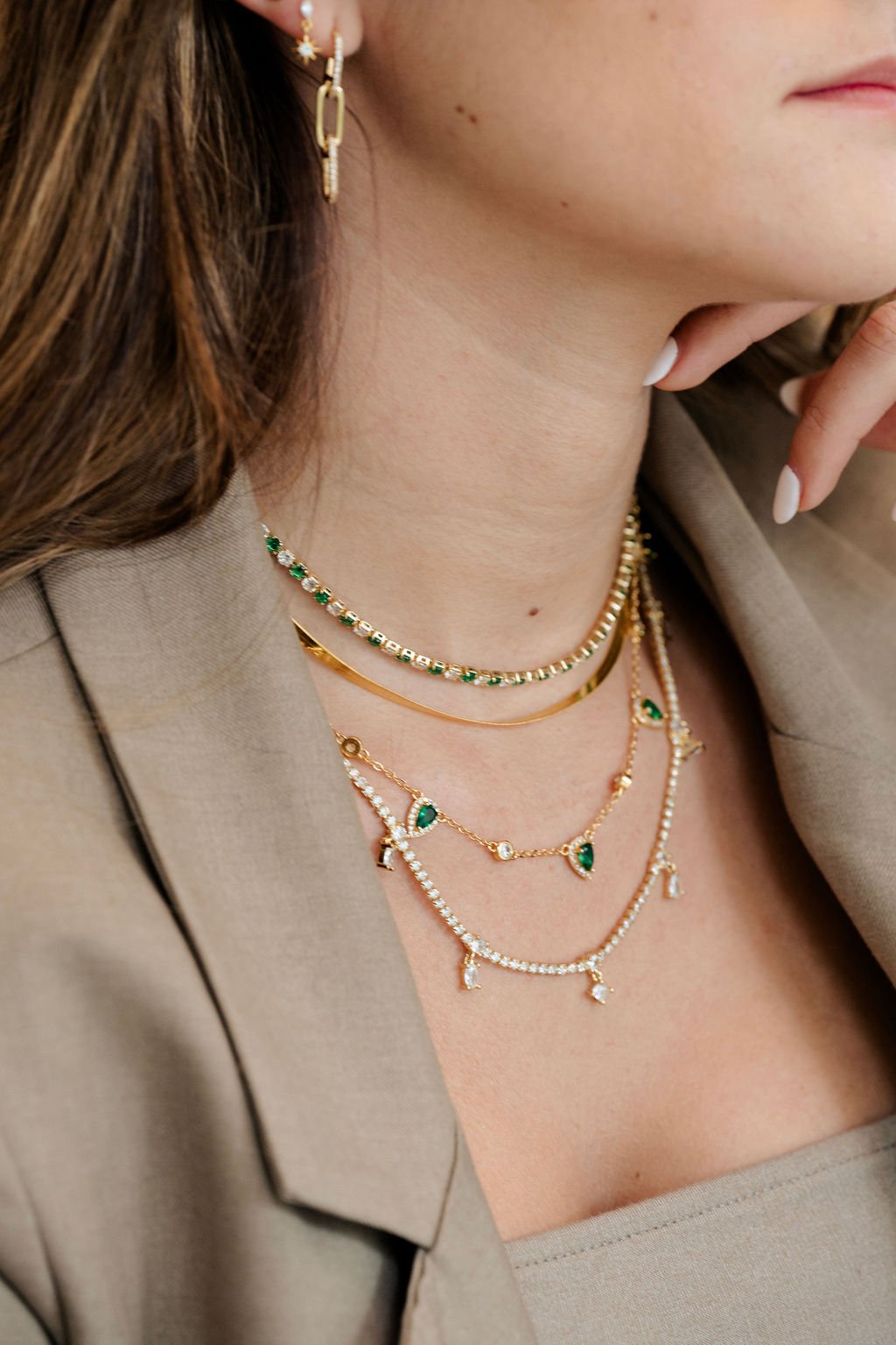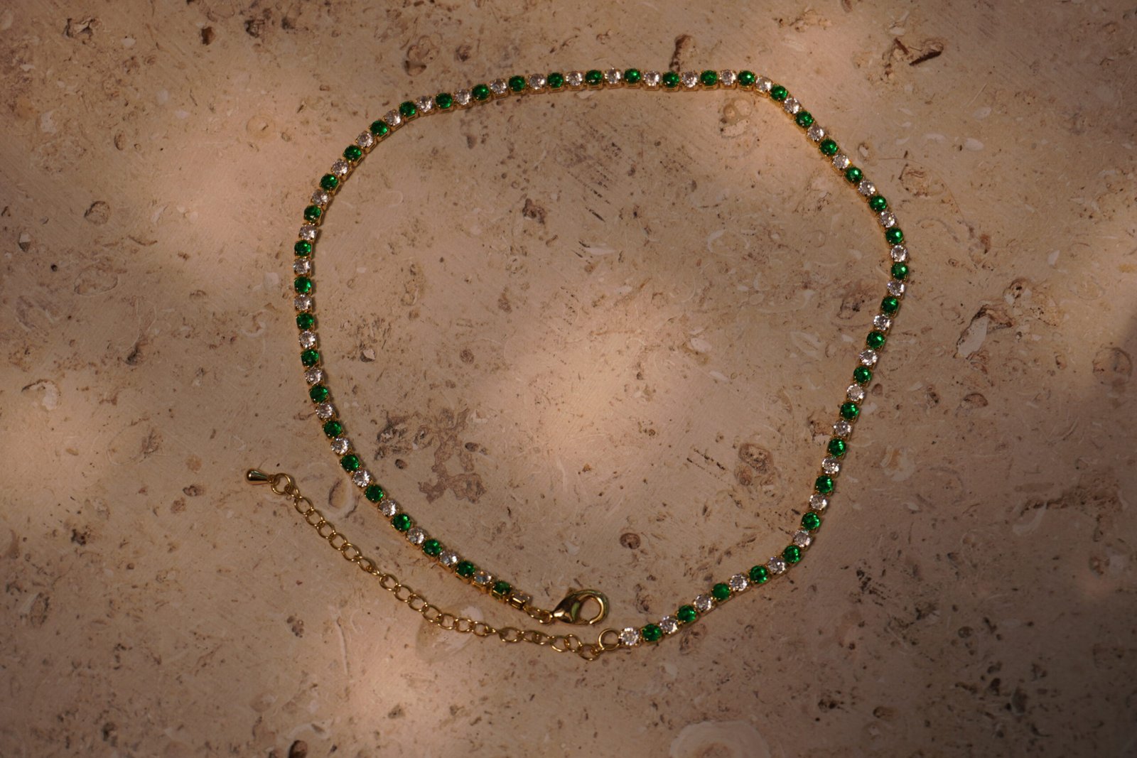 Choker dorado con una hilera de circonias verdes y blancas que aportan un toque vibrante y un brillo sofisticado.