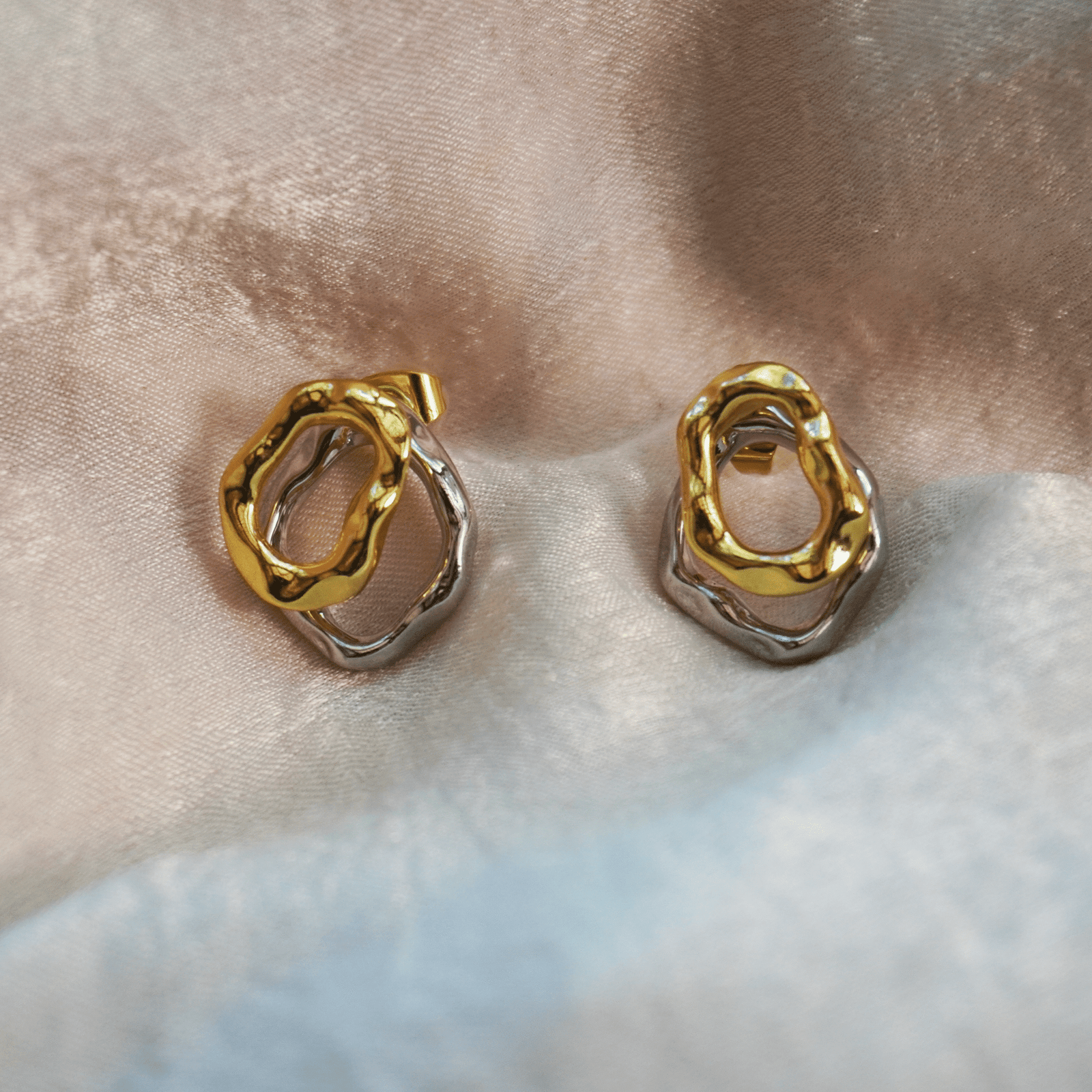 Aretes pequeños de forma orgánica con acabado bicolor: dorado y plateado entrelazados, simulando metal fundido. Una pieza artística y moderna, ideal para destacar con sutileza..