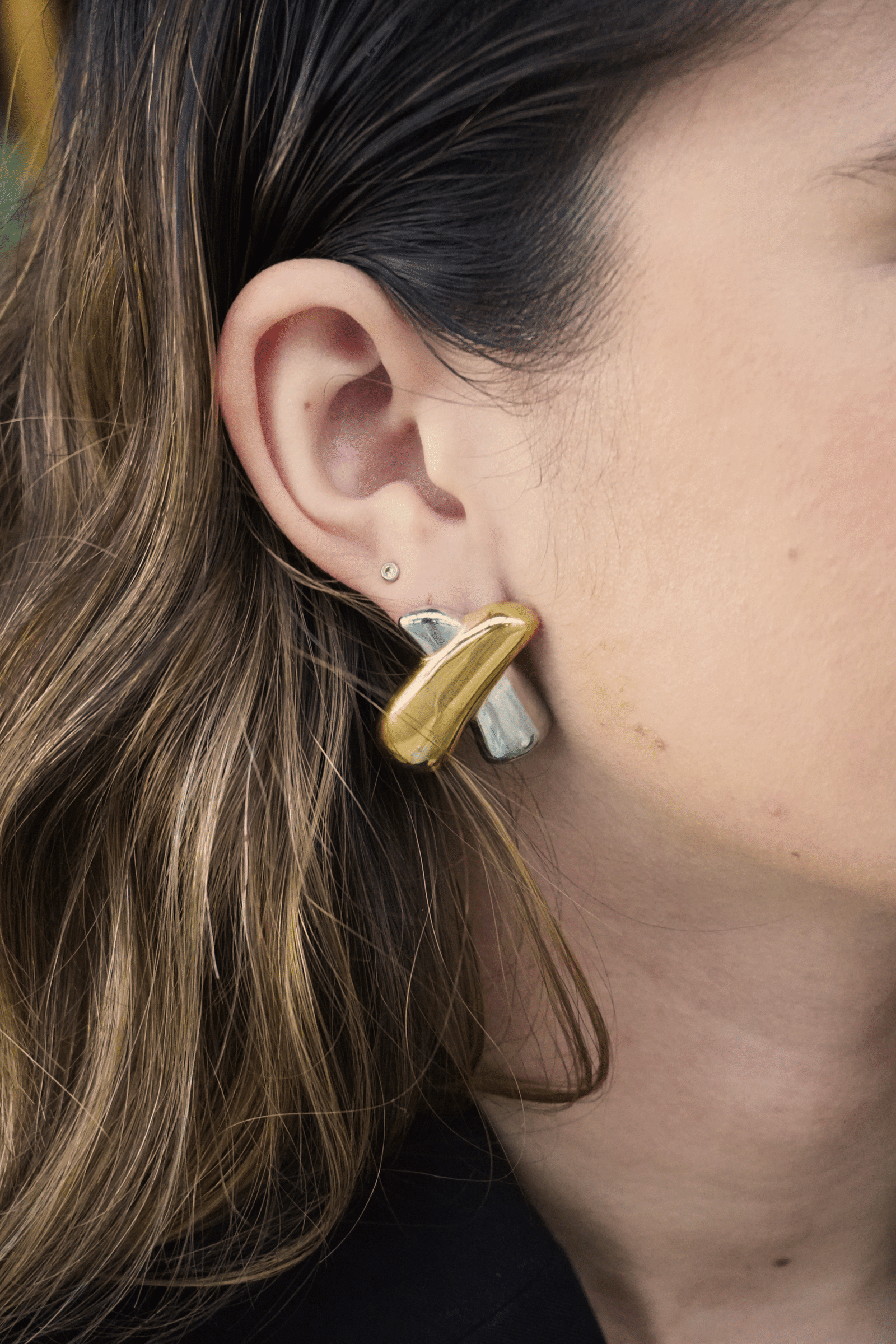 Aretes bicolor en dorado y plateado con un diseño curvo y pulido que aporta un estilo moderno y minimalista.