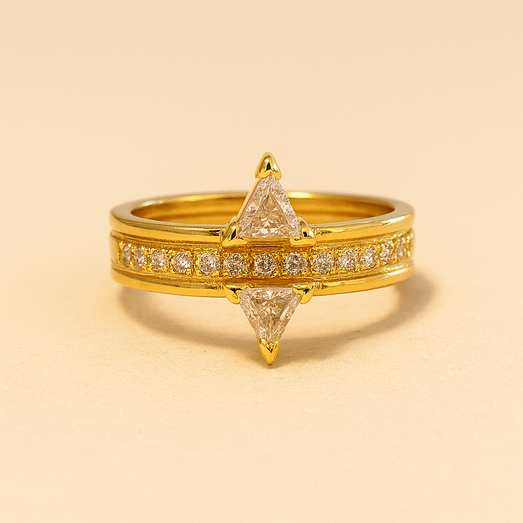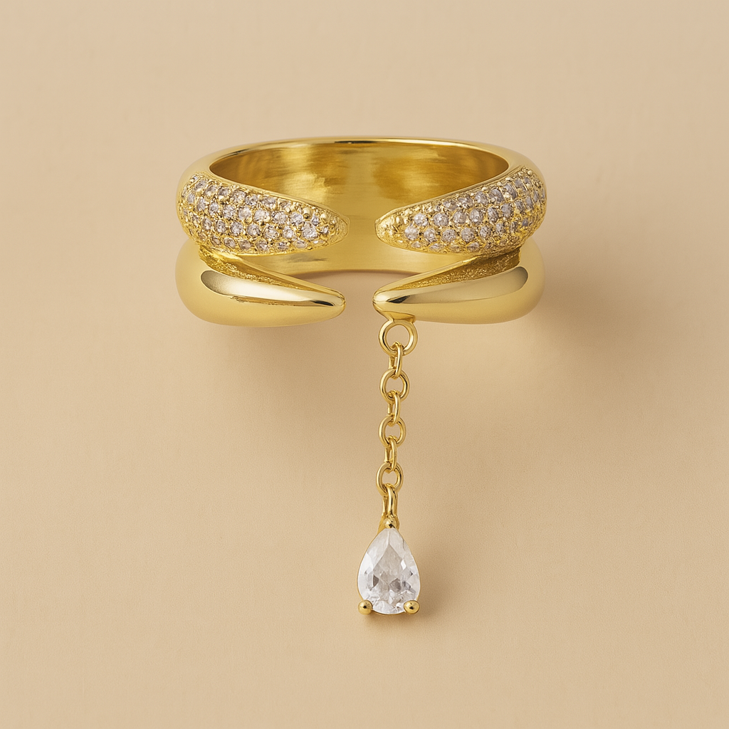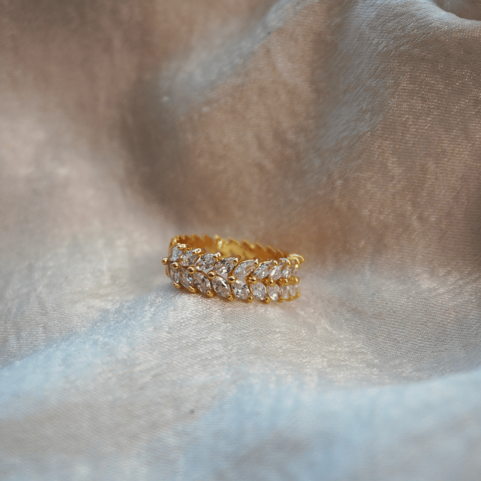 Anillo dorado con circonias en corte marquesa dispuestas en forma de hojas que crean un diseño delicado y un brillo deslumbrante.