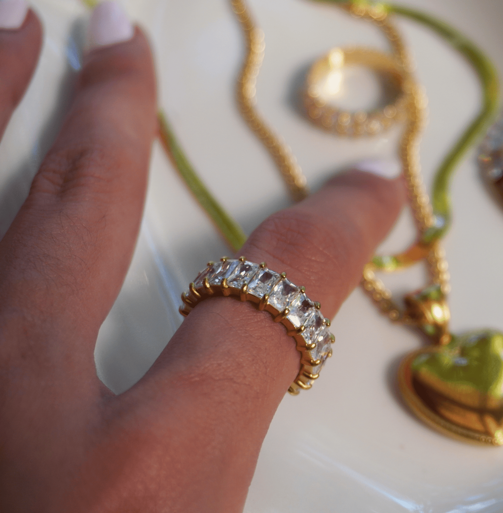 – Material: Cobre – Baño: Oro 18K – Piedras: Circonias cúbicas de alta calidad – Color: Dorado / Plateado / Bicolor – Medidas: 4mm – Tallas: 6, 7, 8