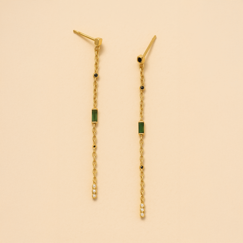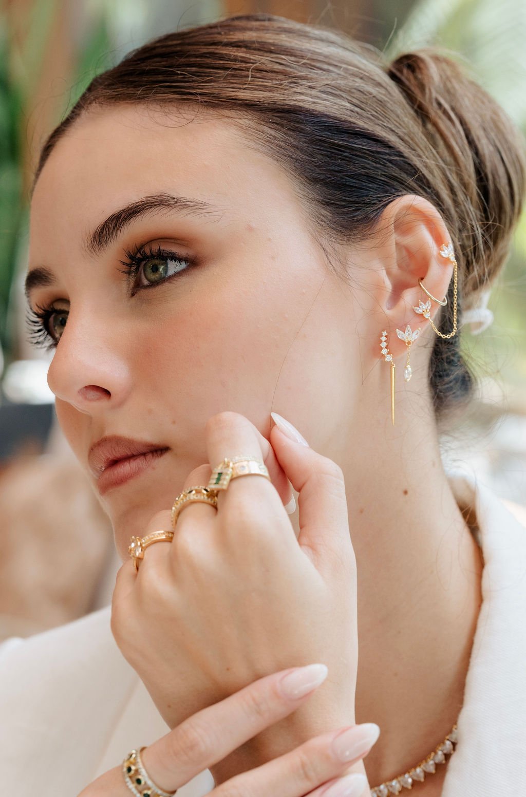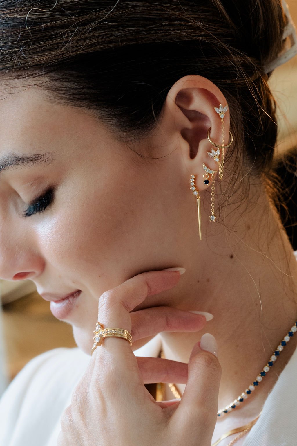 Aretes dorados con circonias en forma de pétalo unidos por una delicada cadena que aporta un toque elegante y femenino.