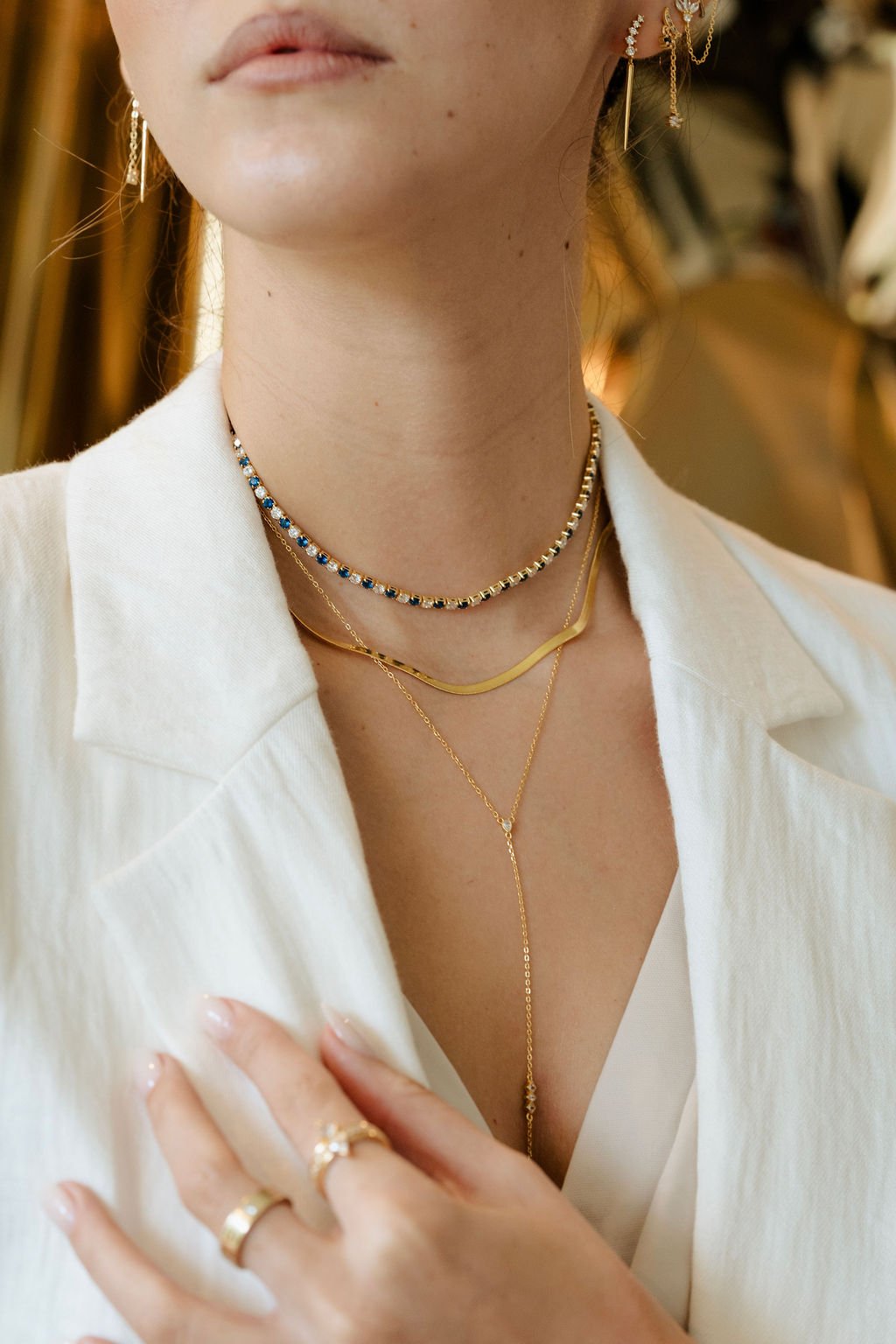 Collar dorado tipo lariat con una delicada cadena larga y detalles de pequeñas circonias que aportan un acabado elegante y sutil.