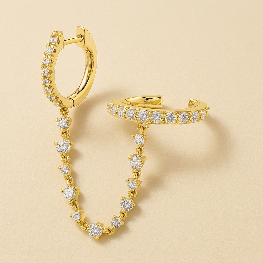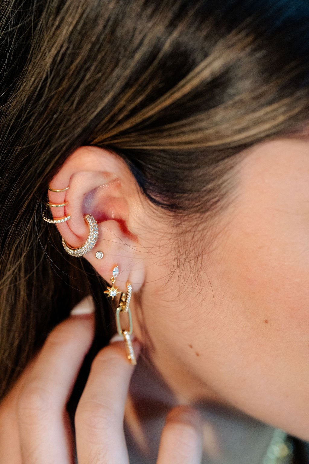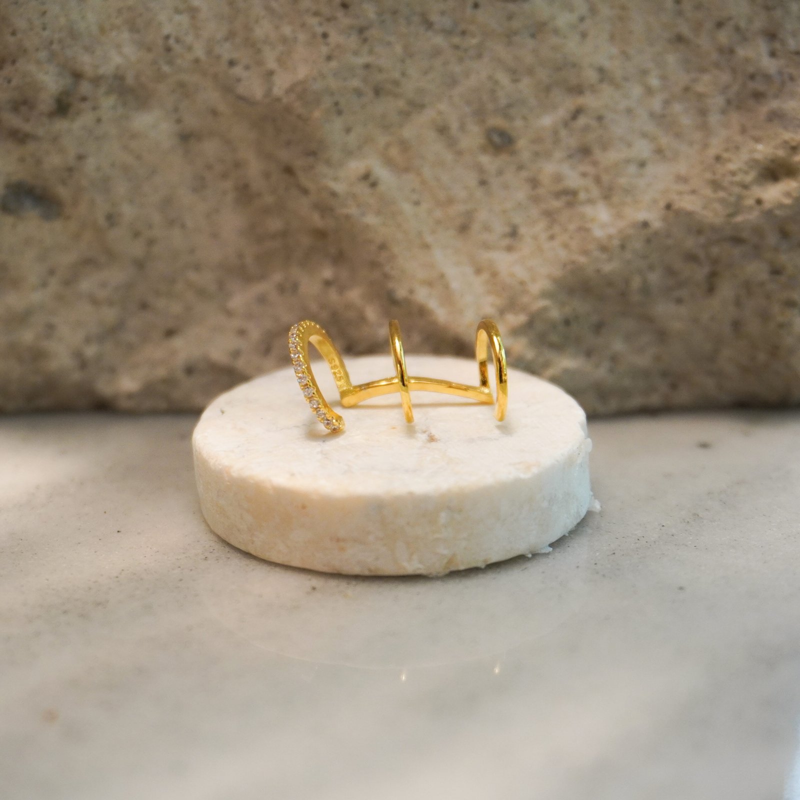Earcuff dorado con diseño minimalista que crea el efecto de tres piercings y un detalle de circonias que aporta un brillo sutil y moderno.