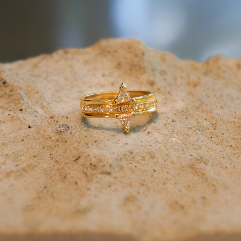 Anillo dorado con circonias blancas engastadas en todo el contorno y dos piedras triangulares enfrentadas que crean un diseño moderno y llamativo.